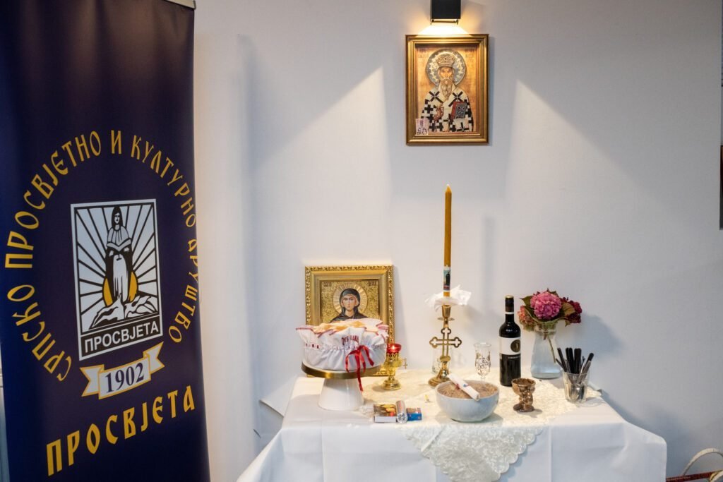Ове године домаћини Славе су били Богдана Брезовац, др, Ана Шерер и Зоран Давидовић. Њих троје чине и Управу Просвјете. Захвалили су се свима окупљенима и нагласили и да се по одзиву на Славу види да је ово друштво пронашло своје мјесто у српској заједници у Немачкој. На Славу су им дошле званице из свих дијелова Немачке, представници удружења, истакнути појединци али и веома угледни гости из Београда.