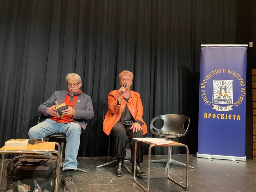 Прво вече посјете је било резервисано за одрасле и све заљубљенике у писану ријеч. Сала предвиђена за ово вече је била испуњена до последњег мјеста а имали смо и публику која је стајала више од два сата да би могли уживати у стиховима и прози наших савременика који су нам дошли у посјету из Србије и Републике Српске. Овом вечери се потврдило правило да је наша дијаспора жељна оваквих врхунских културних дешавања и да није изгубила везу са отаџбином и истинским вриједностима наше културне сцене. Смјењивали су се писци са читањем својих садржаја намјењених специјално за ову прилику. Преживјели смо све црне јаме српског страдања кроз казивање Милоша Јанковића и занијемили смо пред суровом истином затирања свега српског у стиховима Зорана Костића. Заједно са Мухаремом Баздуљ пропутовали смо кроз прошлост и садашњост, кроз бесмислено распадање бивше нам заједничке државе.